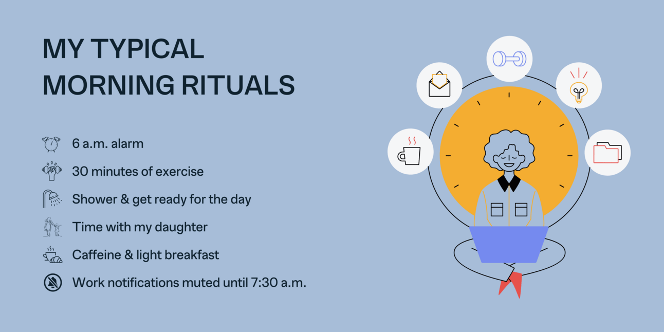 I’ve never been able to pull off (nor am I sure I want to) the 2-hour morning routines of CEOs you sometimes read about — the 3:30 a.m. alarm, followed by meditation, exercise, a balanced breakfast, reading the news and catching up on important emails, all before 6 a.m. However, I do appreciate the benefit of certain morning rituals to get my day off to a positive start.