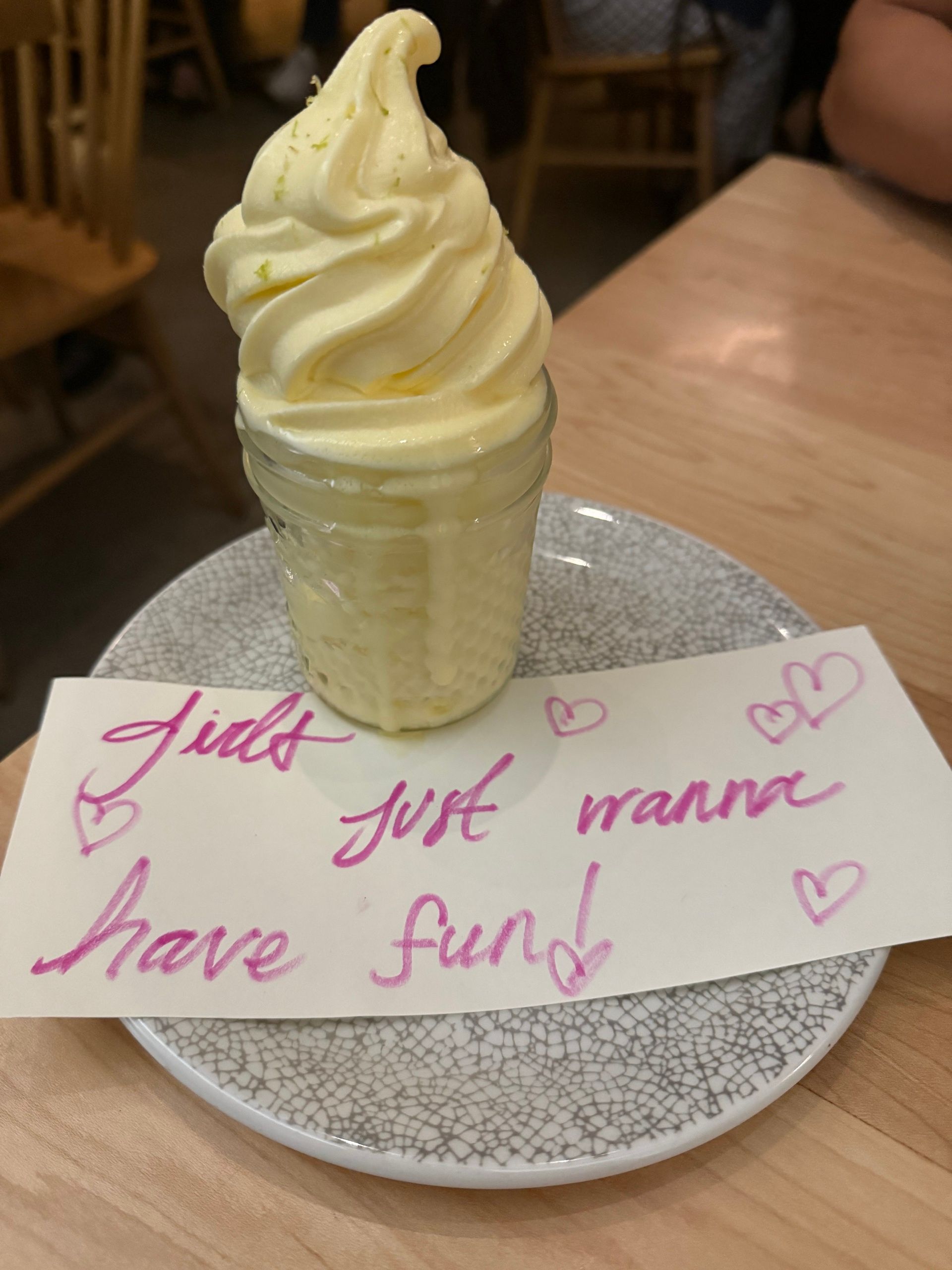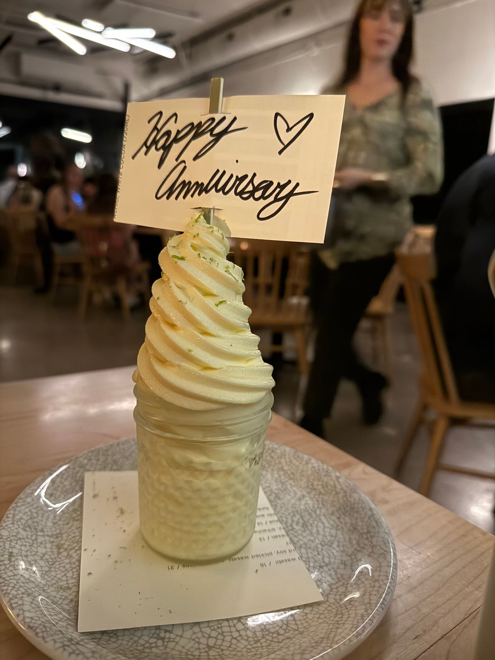 When we checked in, the hostess greeted us warmly and promptly wished us a happy anniversary. Subsequently, every single staff member who came to our table acknowledged our anniversary and wished us a great evening. At the end of the meal, we received a complimentary dessert with a “Happy Anniversary” note attached to the top of a soft-serve swirl.